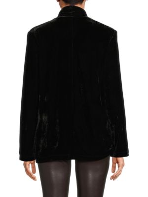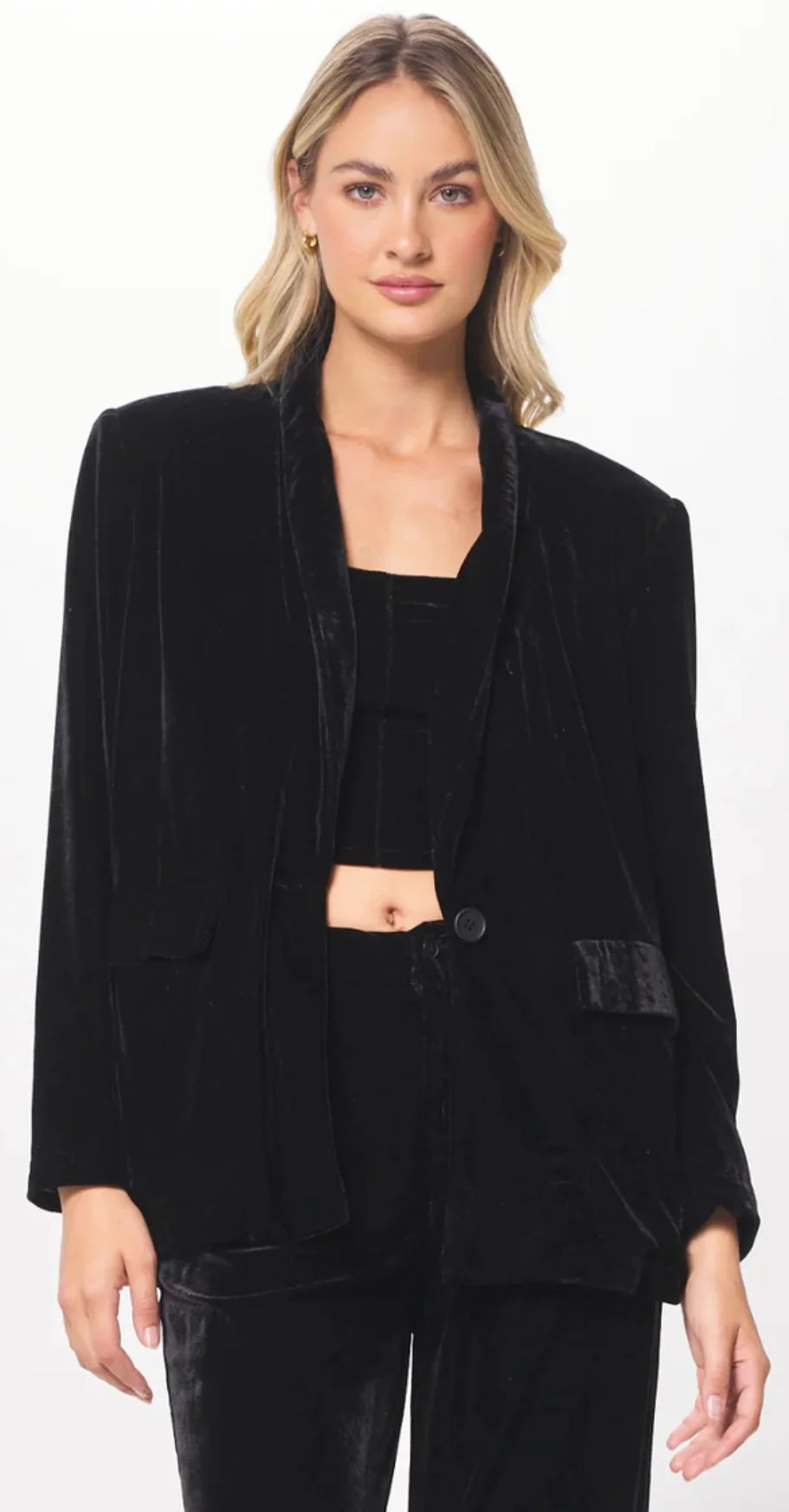 An elevated version of your favorite classic blazer.Oversized shawl collar velvet blazer has flap pockets and is fully lined