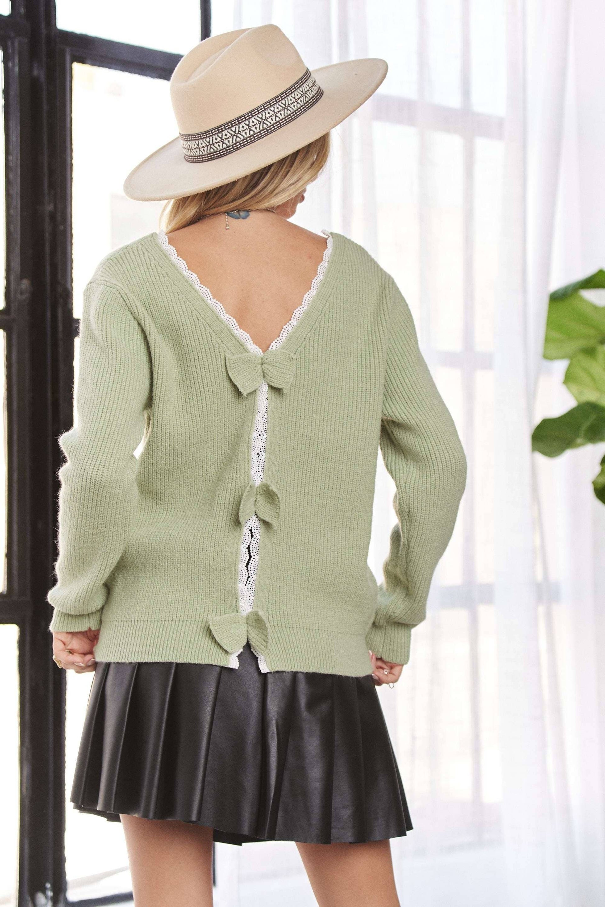 LACE TRIM V NECK SWEATER TOP WITH BOW BACK ACCENT
