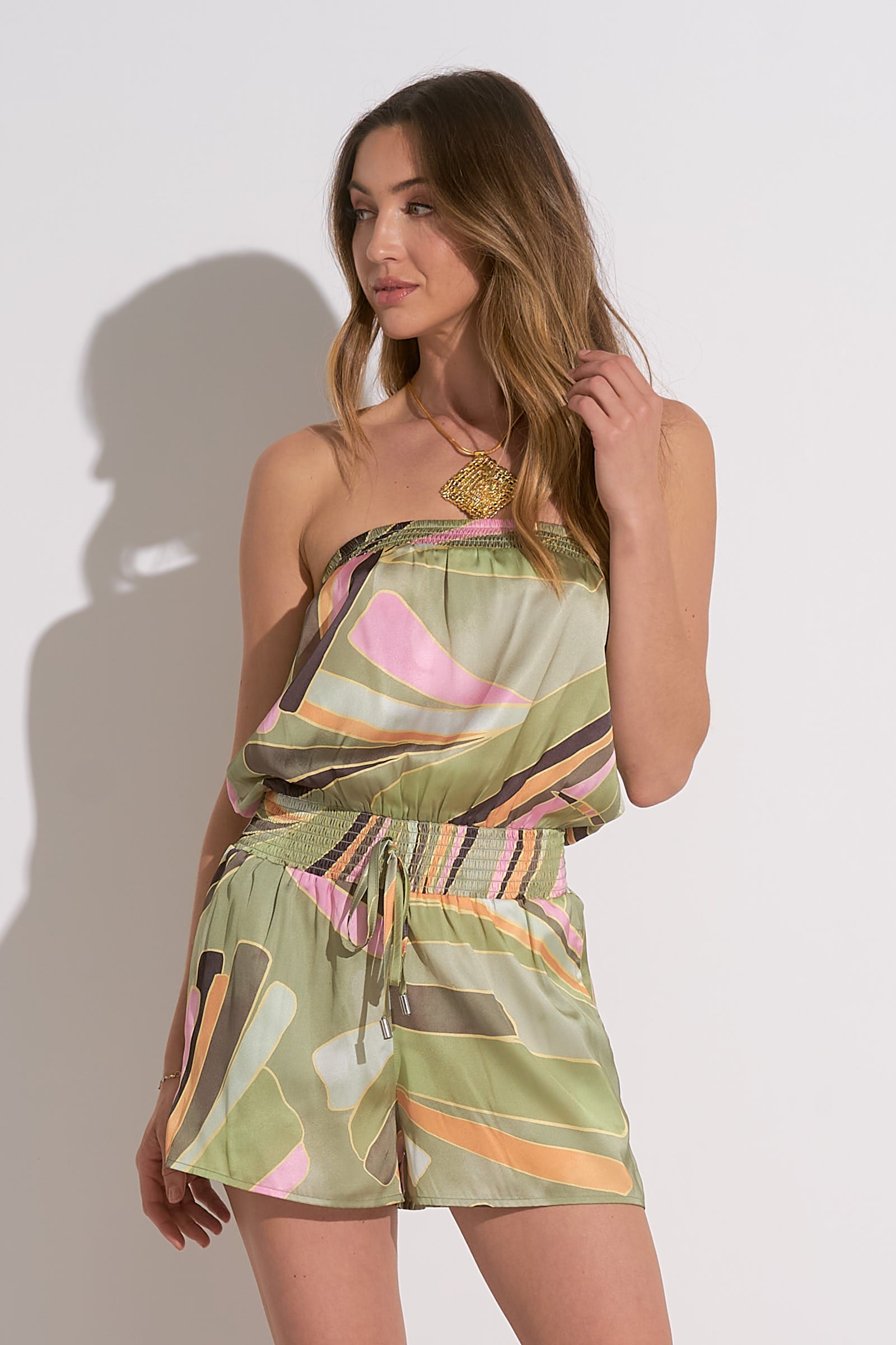 Get ready to turn heads in the Brenna Romper! This strapless romper features a unique green manila print and is made of silky material for a luxurious feel. Plus, it has pockets for convenience. Who says fashion can't be functional? (Hint: not us!)