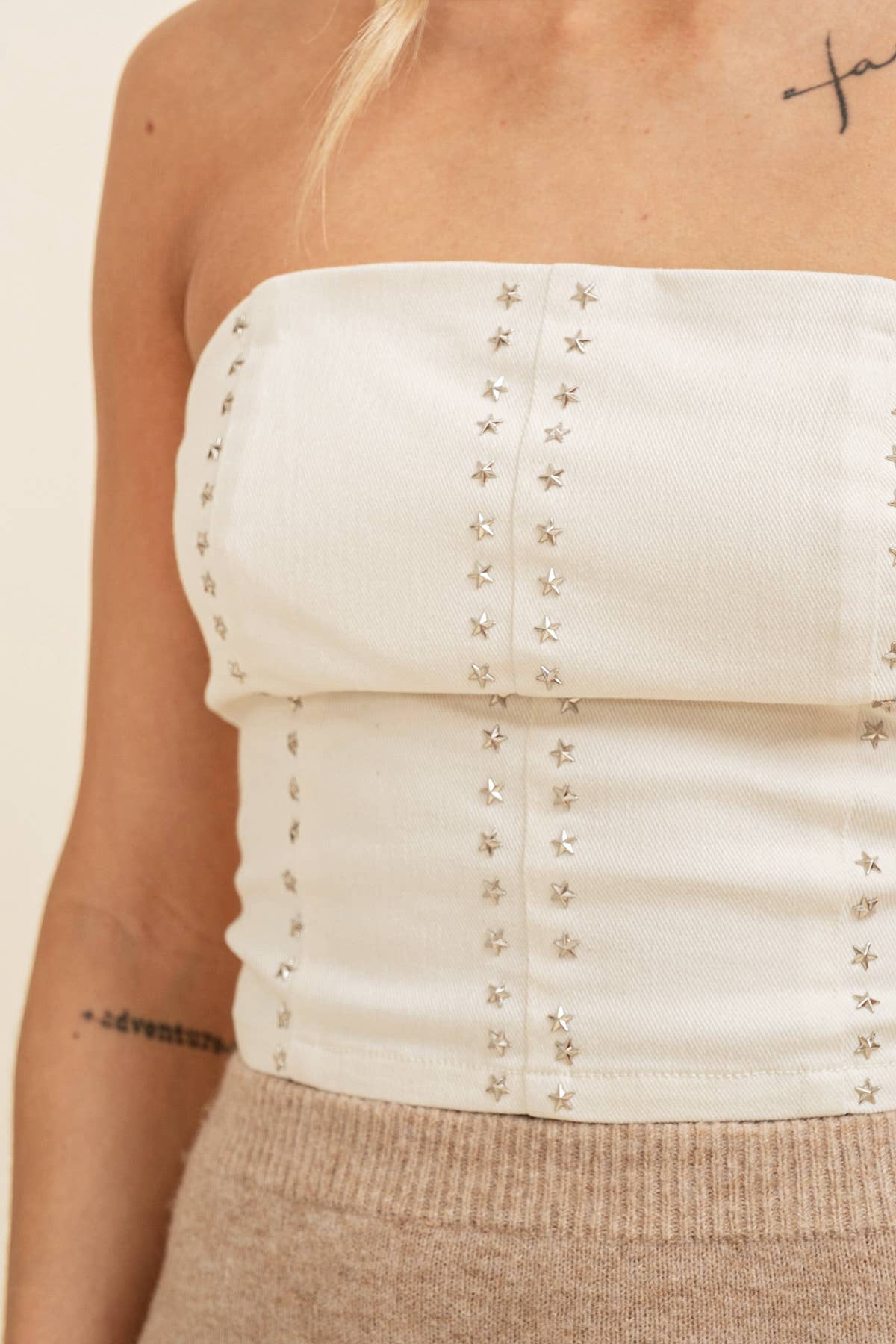 Experience the perfect blend of retro and contemporary fashion with Chloe strapless top. This star-studded, strapless top is an ideal choice for everyday wear during the spring and summer seasons. It's a nod to the chic, edgy style that defines the modern woman. For best care, machine wash this top. Enjoy the vintage aesthetic of this top, it's as trendy as it is timeless.