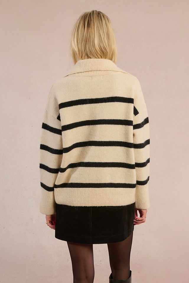 The Felicia Sweater brings playful charm with its classic black and ivory stripes and a chic V-neck collar. Unique cut-outs at the bottom of the sleeves add a fun twist to this cozy, stylish piece—perfect for brightening up any casual outfit.
