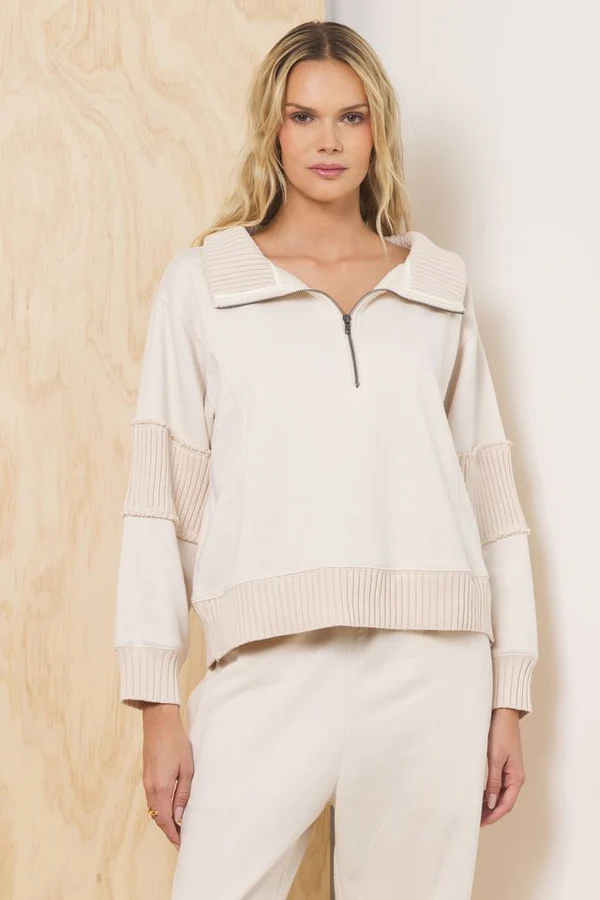 The Fleece Quarter Zip w/ Rib Detail in Bone combines comfort and style with its soft zip-up fleece fabric, perfect for layering on cooler days. Its lightweight warmth and easy-to-wear fit ensure you stay comfortable without sacrificing a polished look. Ideal for those seeking a practical yet refined wardrobe staple.