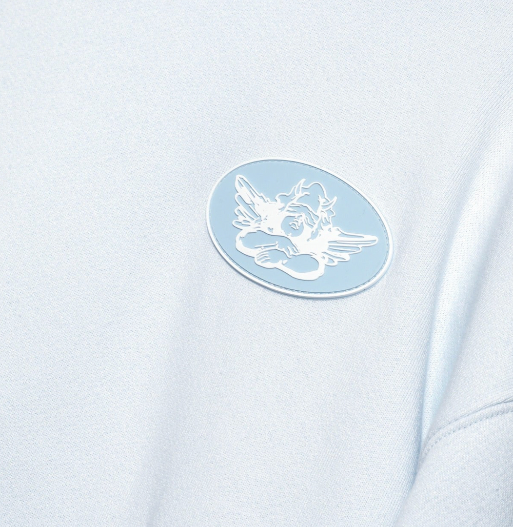 This light blue hoodie offers an easy, relaxed fit with soft fleece for all-day comfort. Featuring an angel logo patch on the front and a "Made in Heaven, But I'm No Angel" graphic on the back, it adds a clean, playful touch to a classic silhouette.