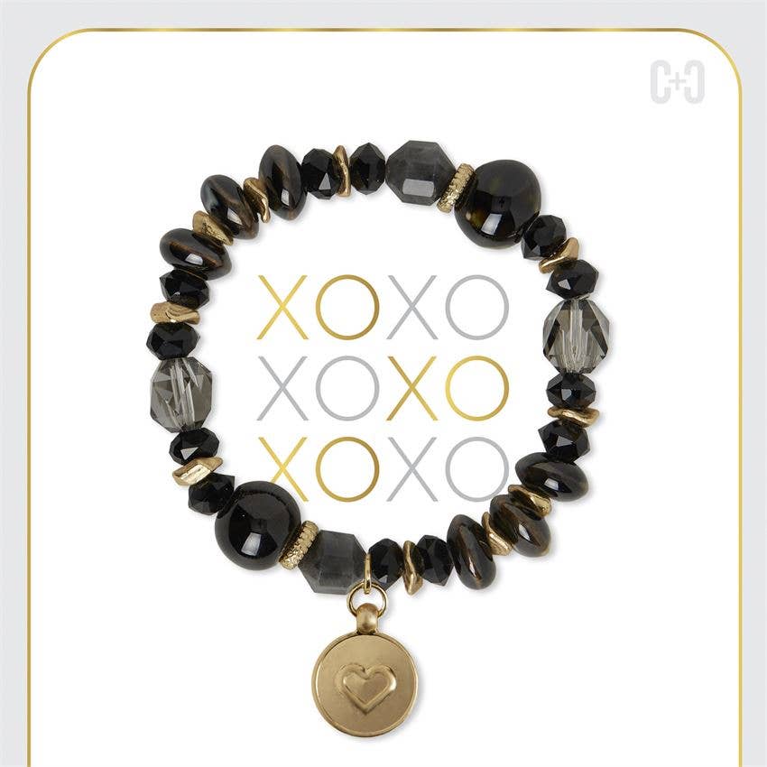 Beautifully carded and ready to gift! A delicate heart charm suspends from a strand of faceted glass beads and imitation gemstone. Each bracelet comes on a sweet sentiment card with a motivational mantra.