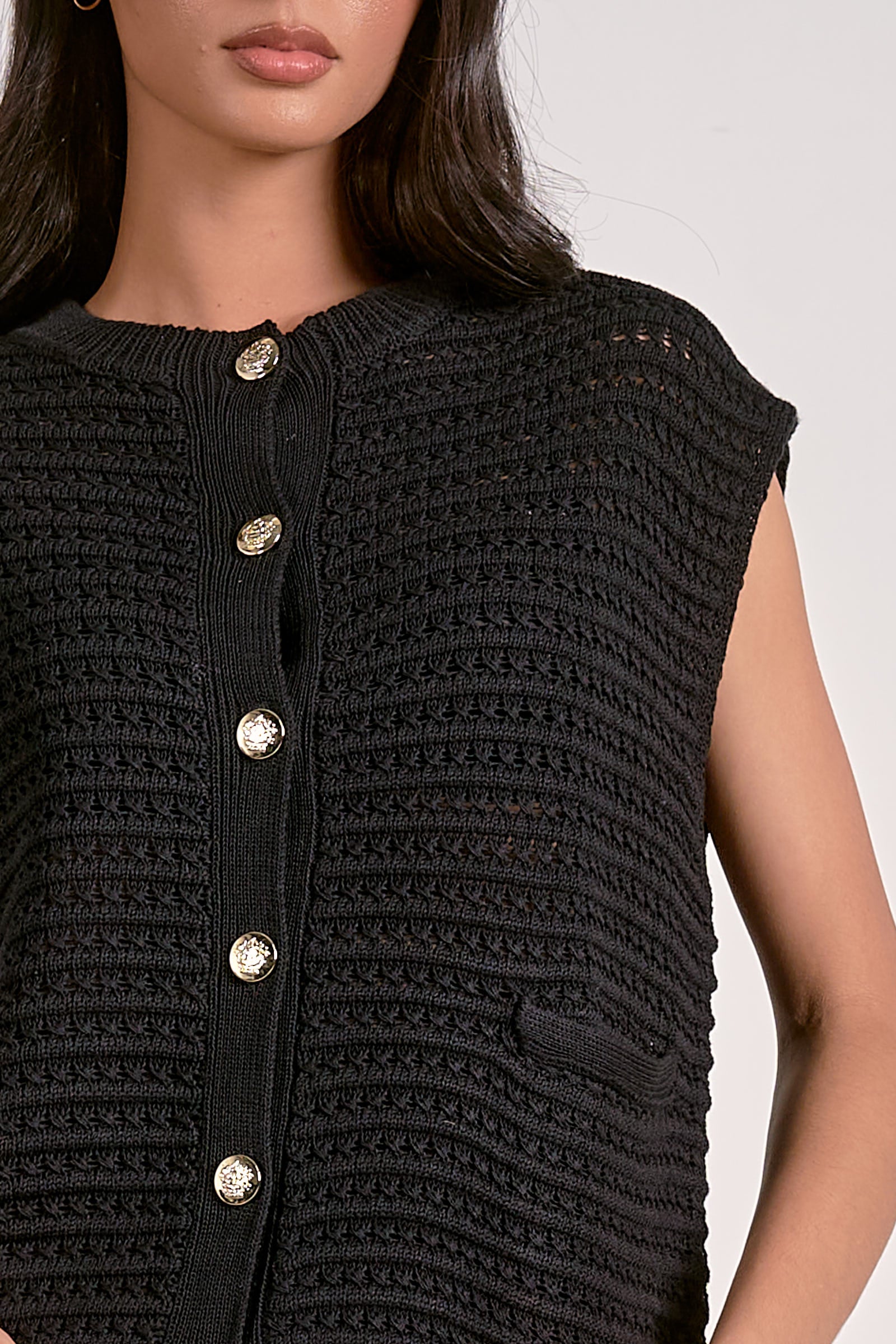 Add a touch of fun to your outfit with the Maria Vest! This open-knit sleeveless vest features shiny gold buttons that catch the light and your eye. Perfect for layering, it brings a playful twist to any look while keeping things breezy and stylish.