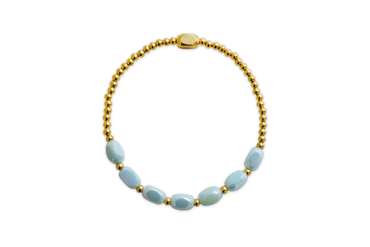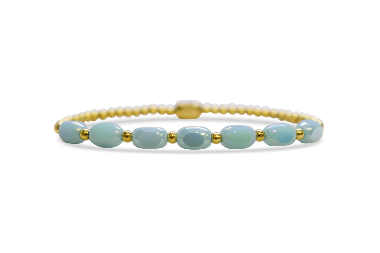 Opalescent glass beads mixed with stainless steel.