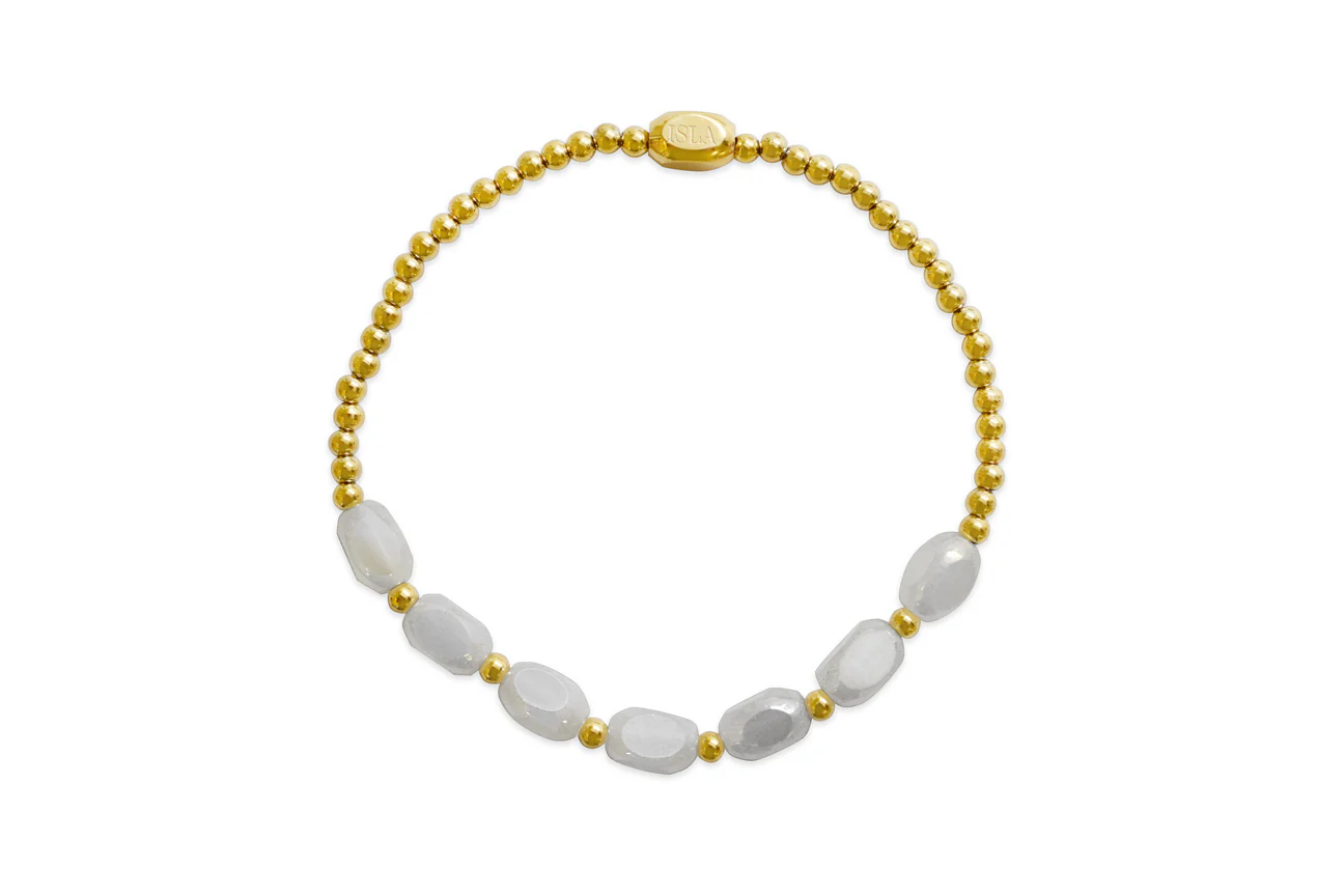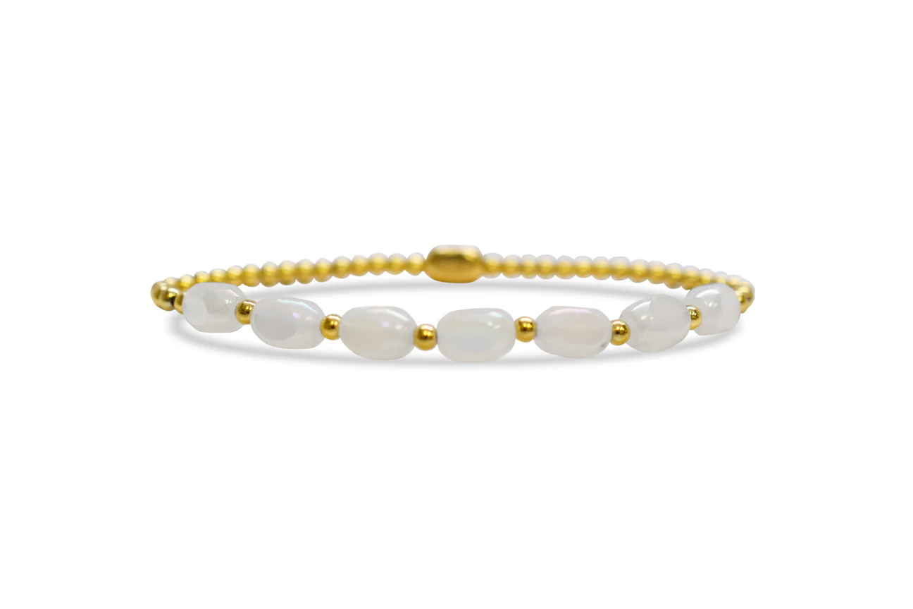 Opalescent glass beads mixed with stainless steel.