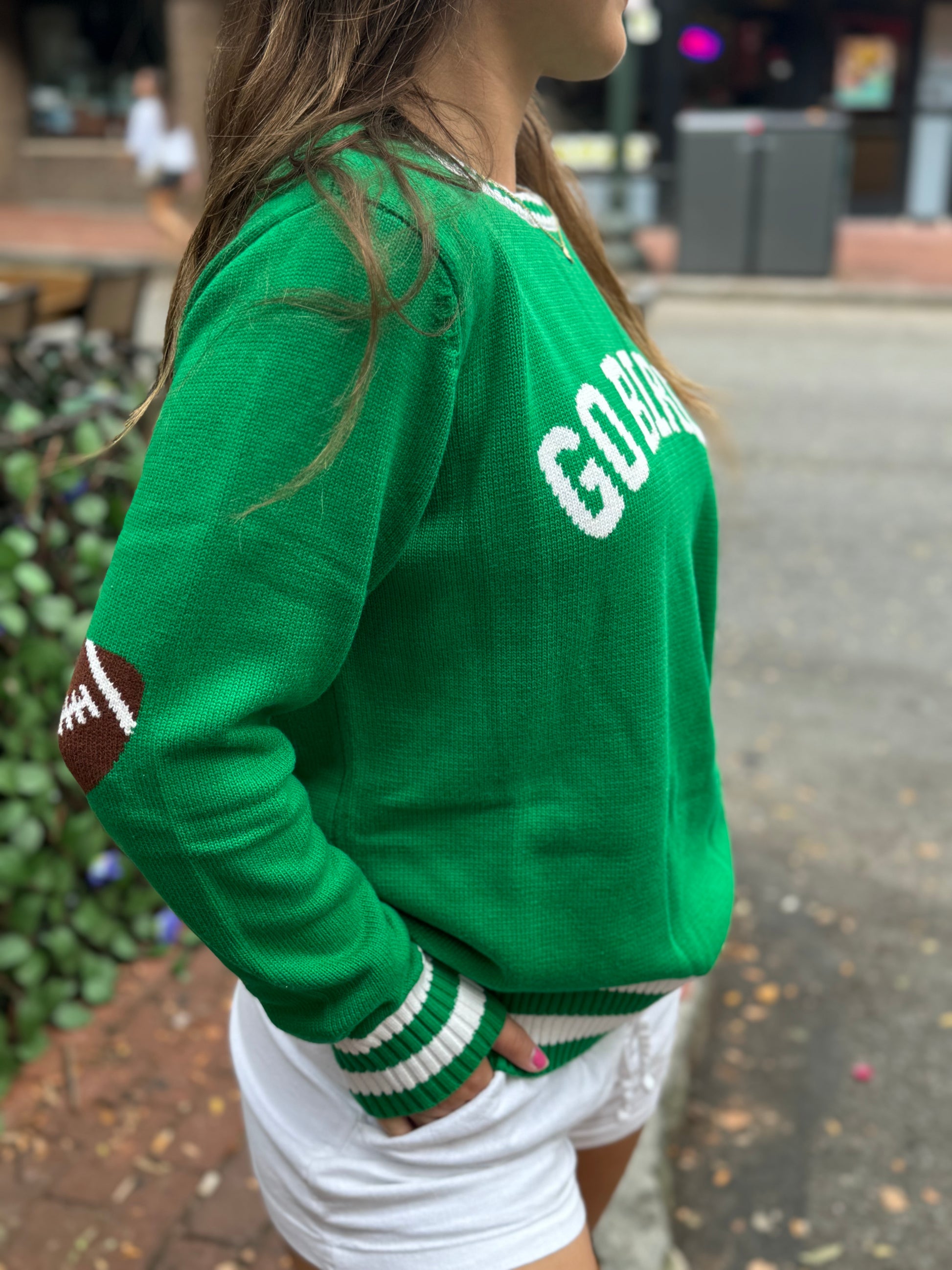 Go Birds Kelly Green Sweater - Football Sleeve Edition Rep Philly pride the in this Go Birds Kelly green sweater, your new game-day go-to. Crafted from a super soft knit blend, this sweater brings serious comfort with a whole lot of attitude. Football detail on the elbow of the garment. Whether you're tailgating, couch coaching, or just out and about, this sweater's vibrant Kelly green color screams hometown pride. Finished with a classic crewneck fit and a relaxed vibe that pairs perfectly with jeans or leggings.