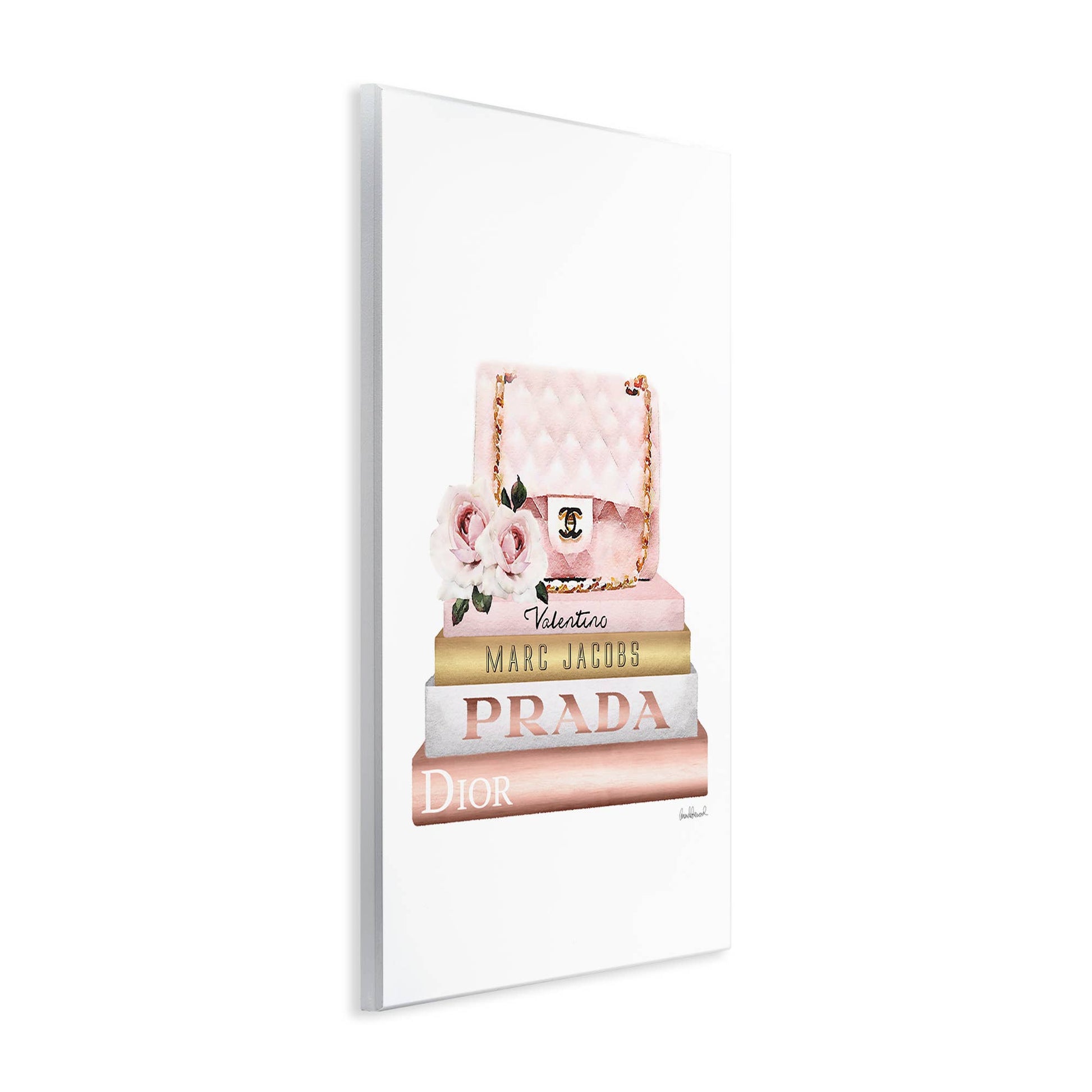 Stupell Industries Pink Purse Gold Bookstack Wall Plaque Design By Amanda Greenwood. Our wall plaques start as high-quality lithograph prints mounted on durable 0.5-inch thick MDF wood. Each piece is hand finished and comes with a fresh layer of white foil on the sides to give it a crisp, clean look. Plaques arrive ready to hang without installation and come with removable plastic corners to keep them from damage in transit. Stupell Industries Wall Art is made in the USA.