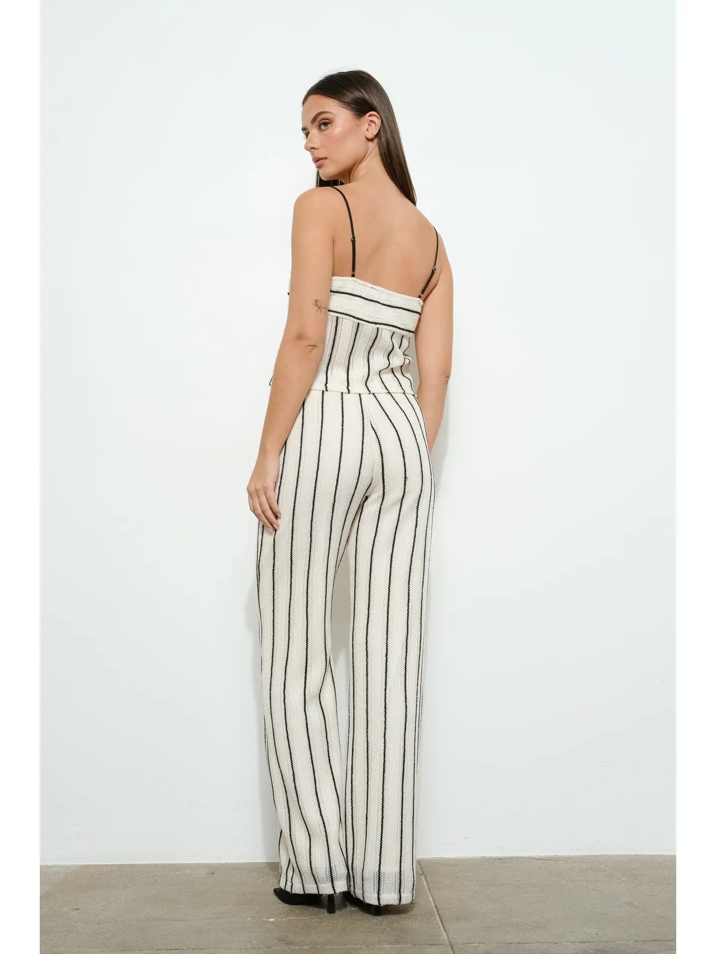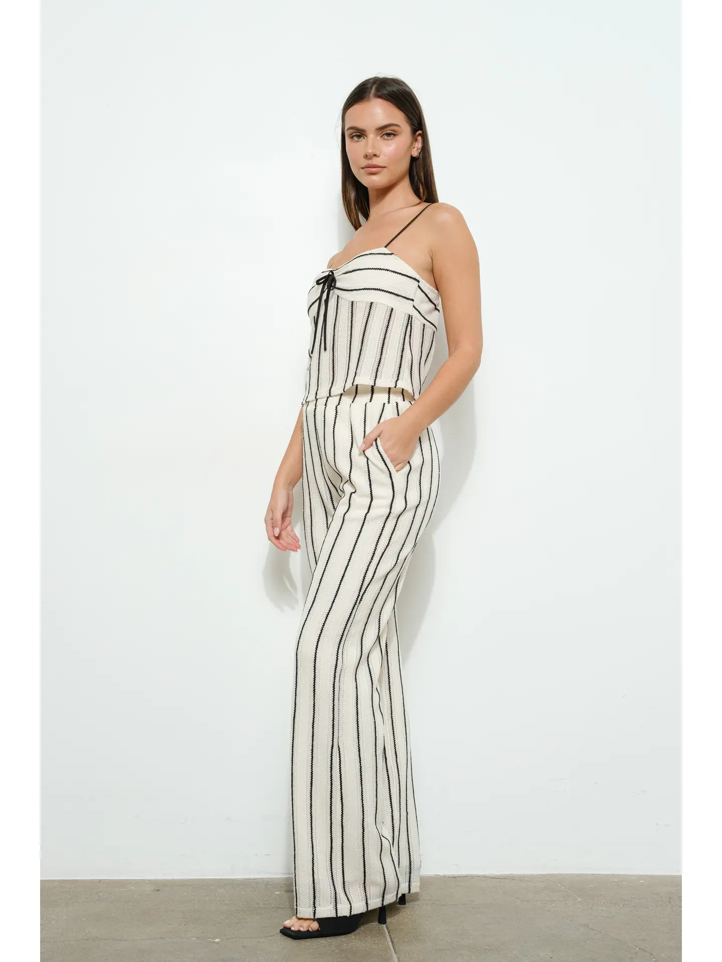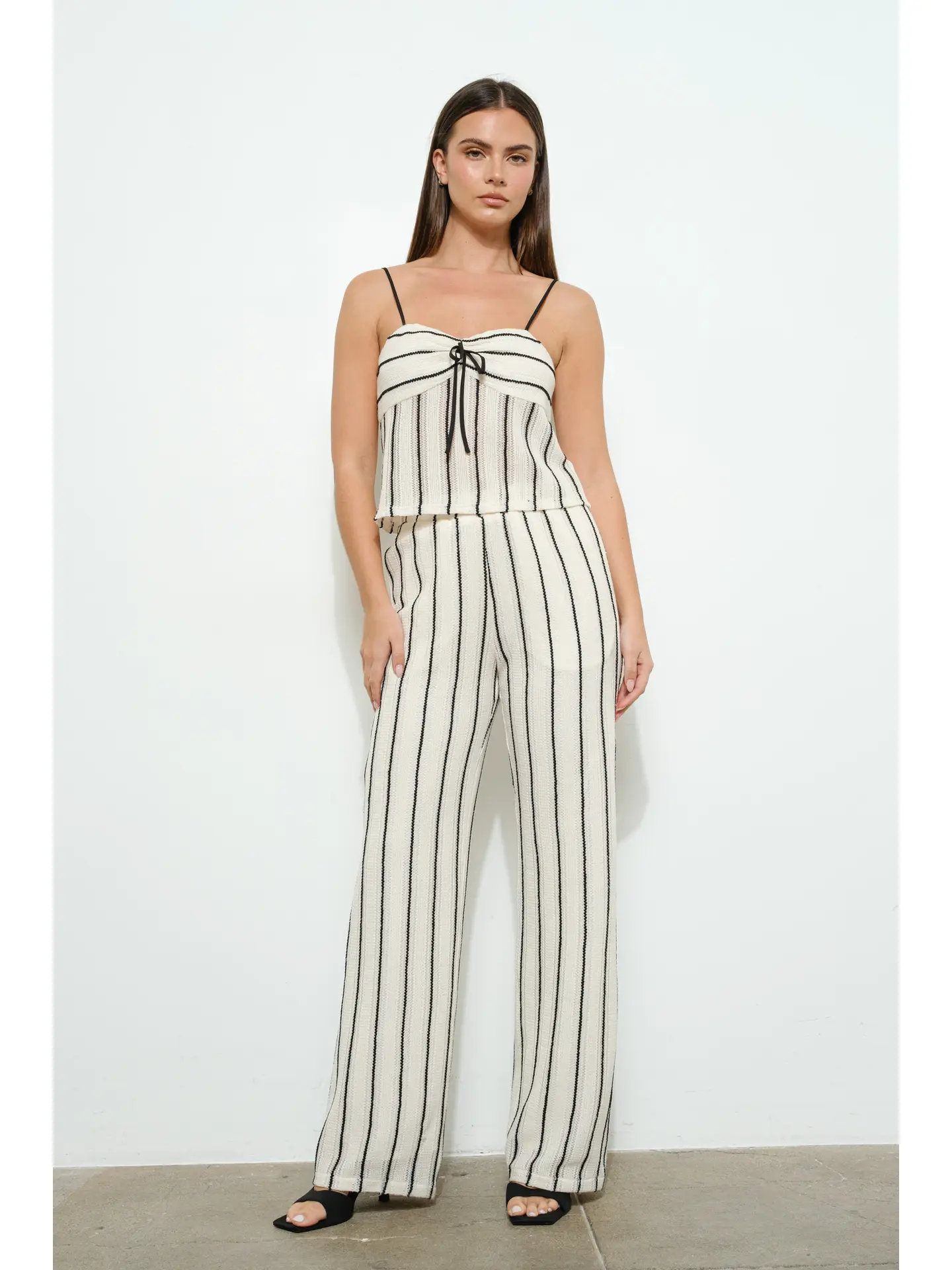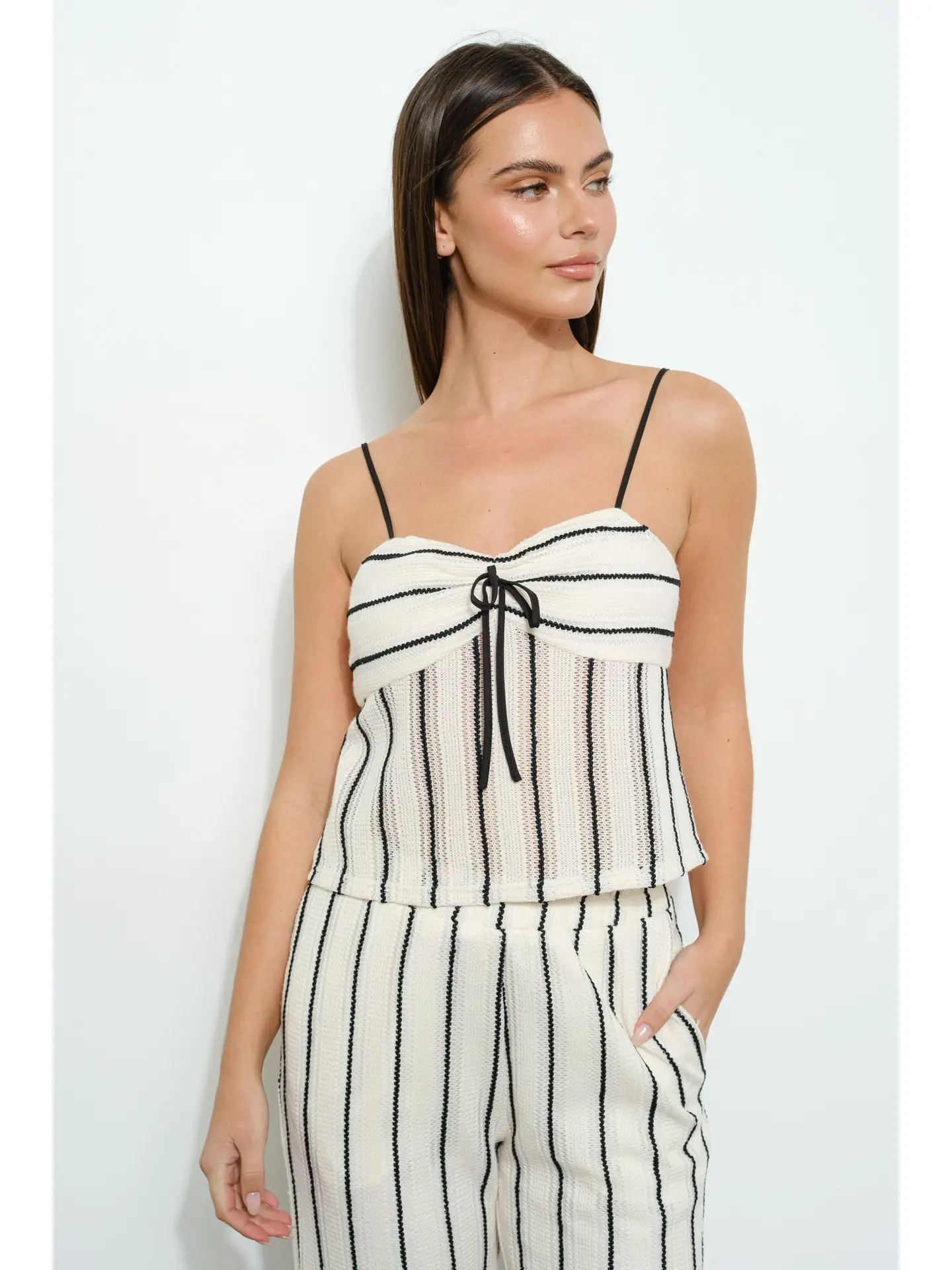 The Rachel Cami Top: The perfect blend of style and comfort. Featuring a rare combination of striped crochet material and adjustable straps, this top also comes with a self tie at the front for a unique touch. The lined bust and matching pants make it a complete set.