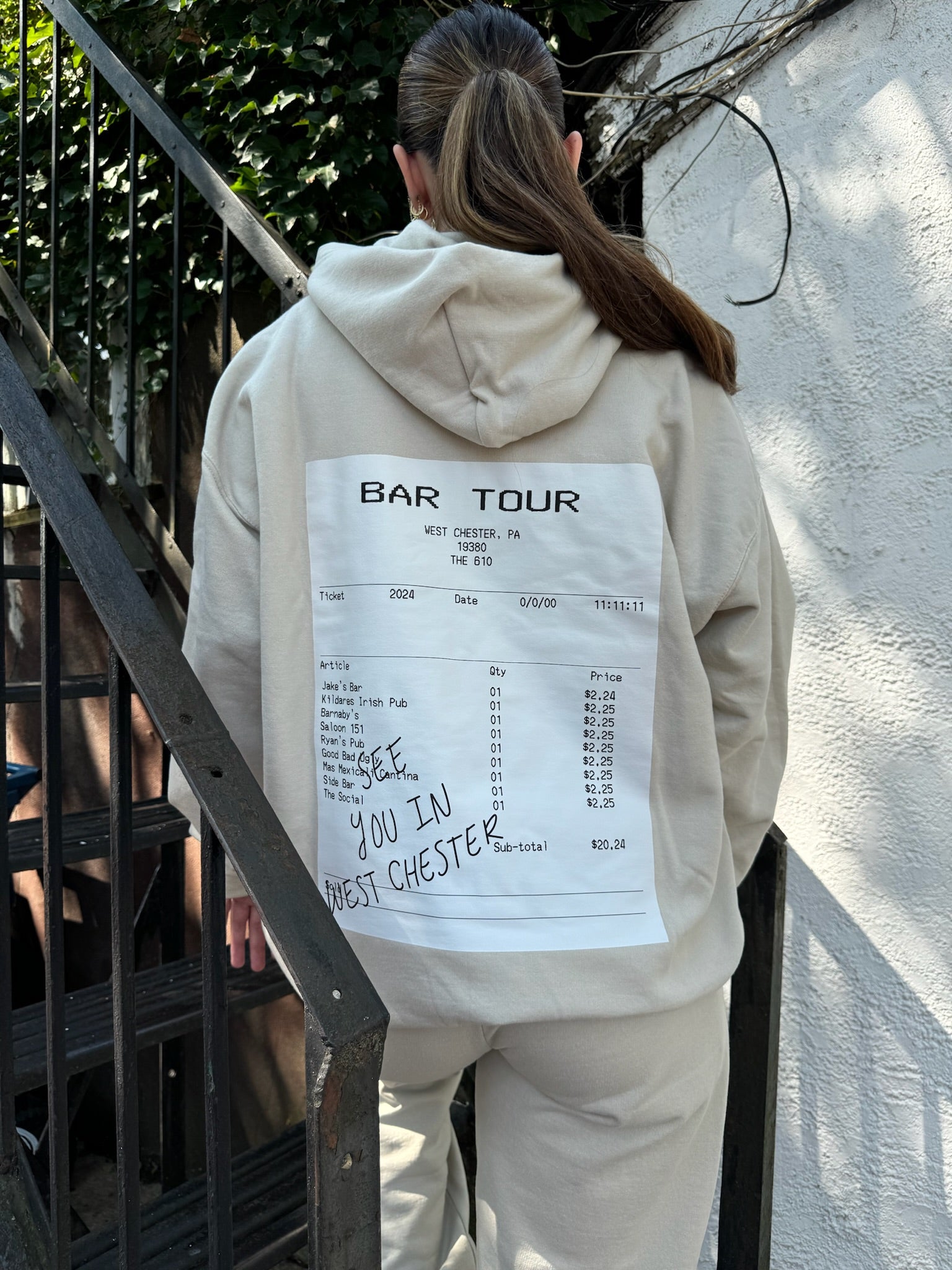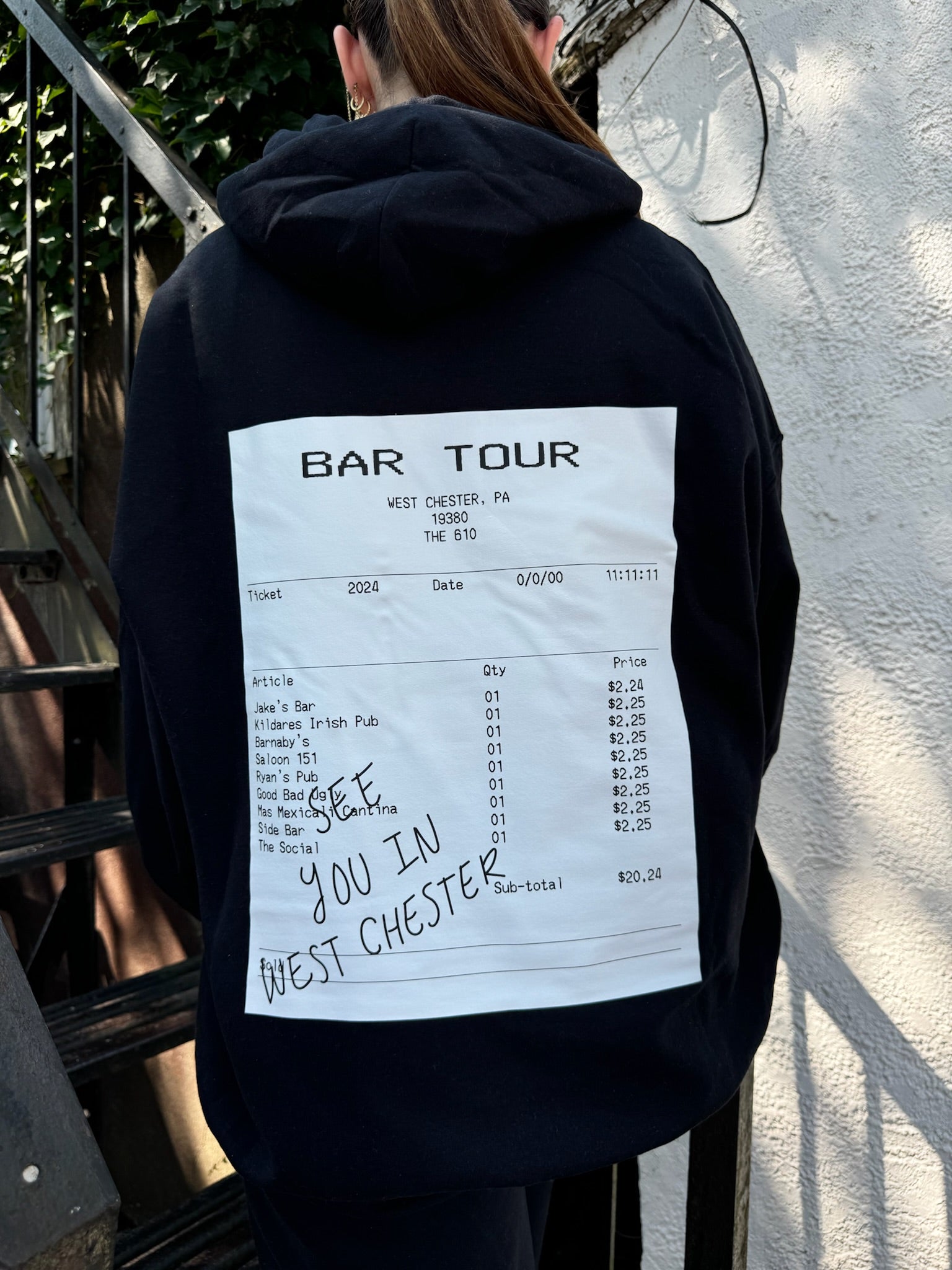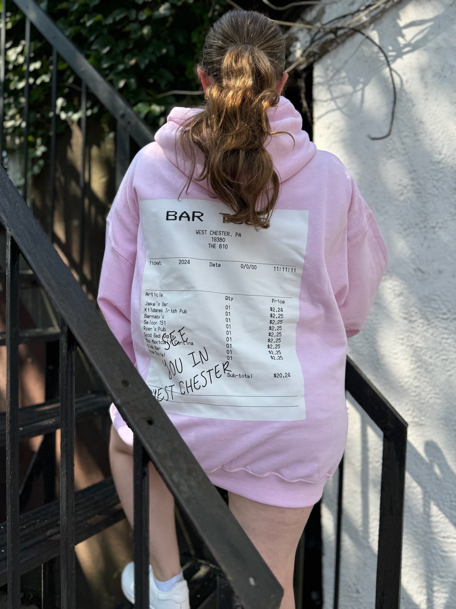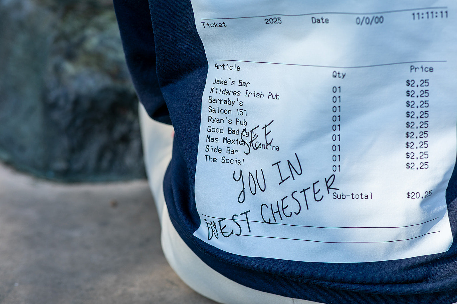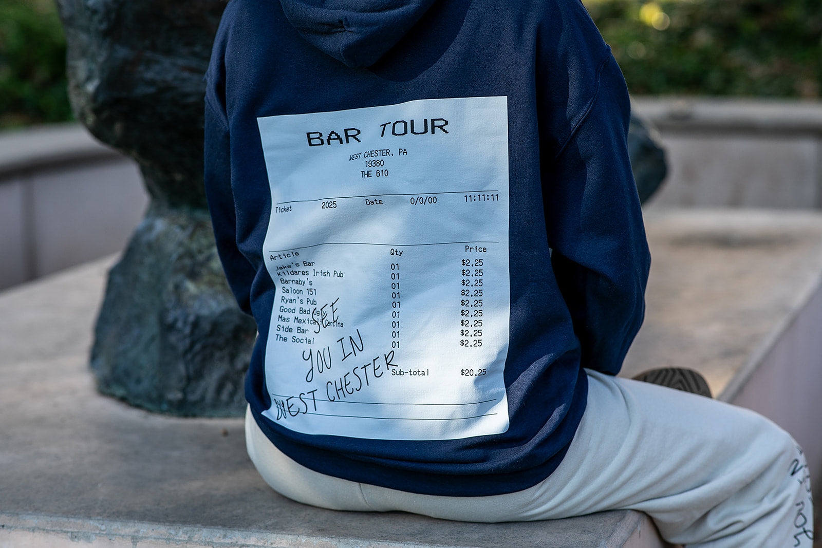 These West Chester Bar Tour hoodies are custom designed by one of our own WCU students and feature all the West Chester college bars listed on the back. The design reflects the year 2025