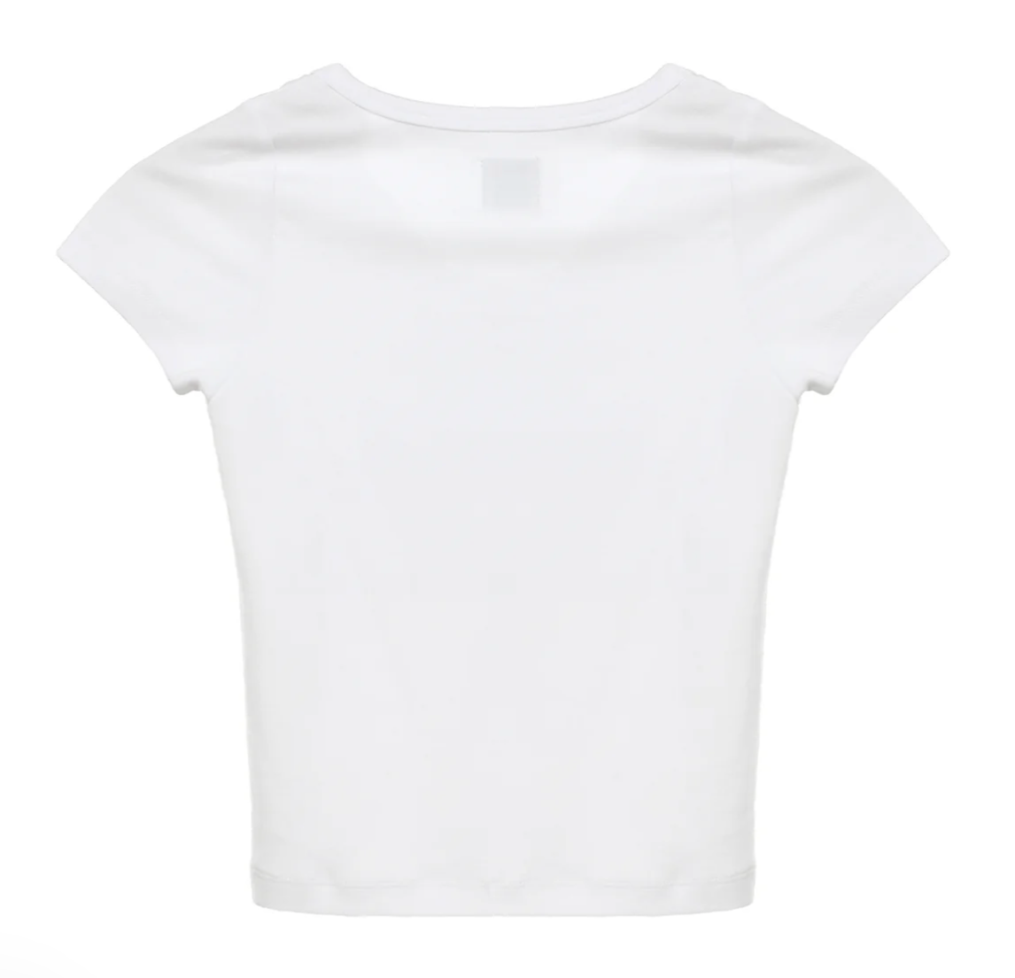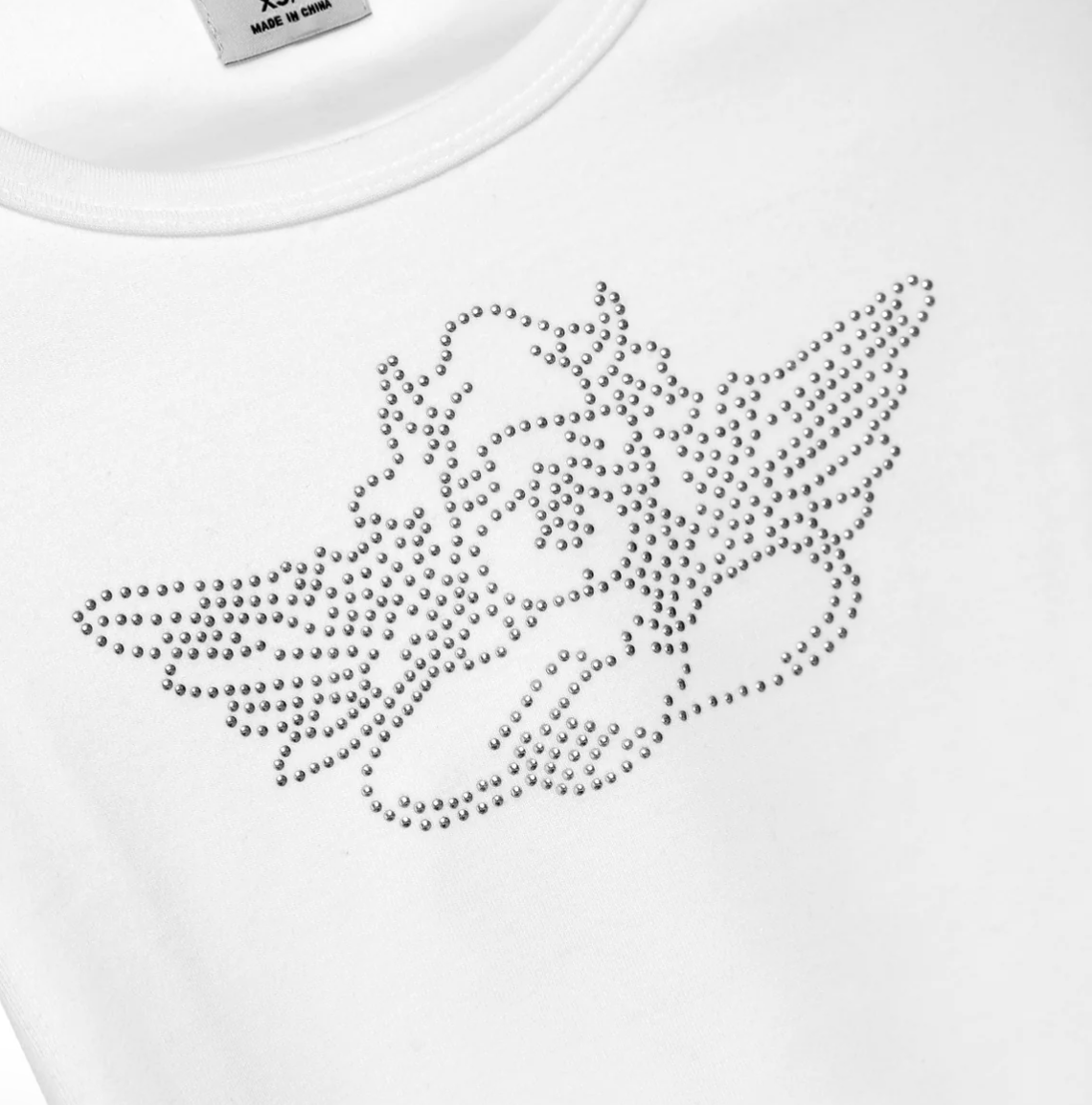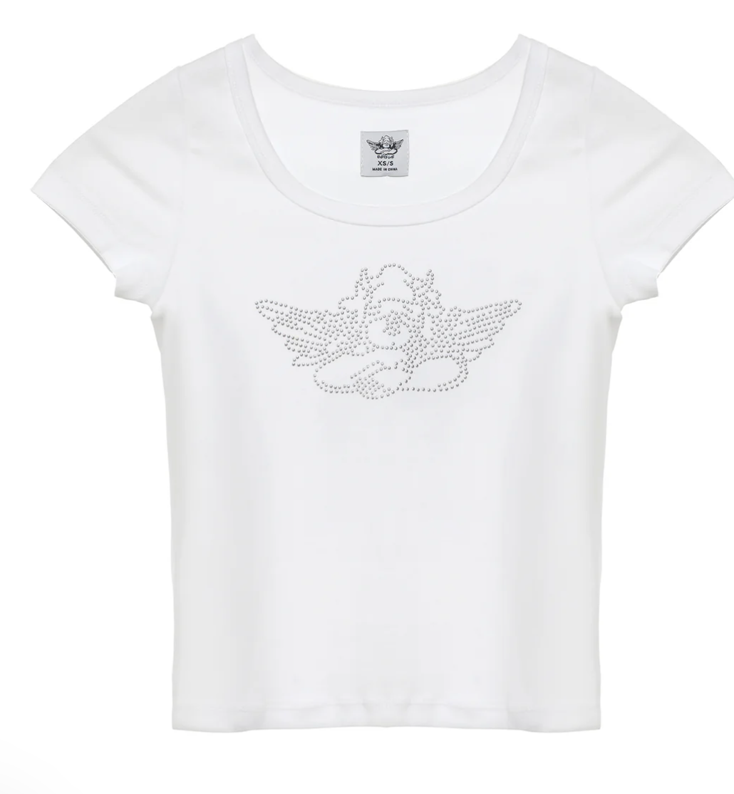 This new silhouette channels classic baby tee vibes in crisp white, featuring a silver studded cherub on the front for a touch of edgy sparkle. Fitted and flirty, it's an easy staple with a bold twist.
